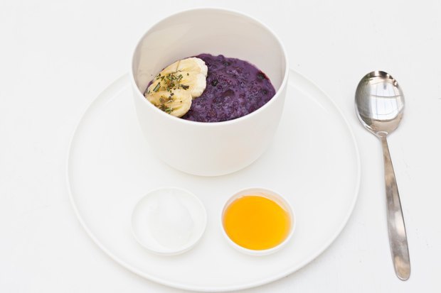 Выкладываем кашу в тарелку, сверху украшаем бананом, нарезанным кольцами, подаём отдельно кокосовое масло и виноградный сироп. В домашних условиях виноградный сироп можно заменить и жидким мёдом.
