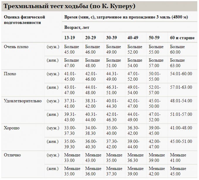 Вообще, всегда считала, что тесты Купера - это про бег. Но нашлась табличка с данными и про ходьбу. Погуглила немного. Источников информации, откуда эти данные, к сожалению, не нашла. Но в данном случае, не суть.