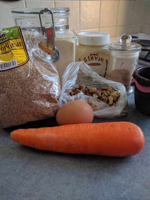 Потребуется крупная сладкая морковка, манка и пшеничные отруби, оливковое масло, одно яйцо, сахзам на ваш вкус, пару штук грецких орехов, щедро корицы и мускатного ореха, щепотка соли, сода, разрыхлитель.
