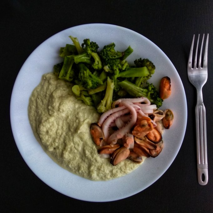Пока брокколи готовилась в микроволновке мелко нарезал и слегка обжарил стебель сельдерея, несколько минут потушил в 20% сливках и, когда сливки выпарились, пробил сельдерей блендером. Идеальный, неяркий, мягкий гарнир к рыбе или миксу из морепродуктов в рассоле, как на фото. Низкокалорийный.