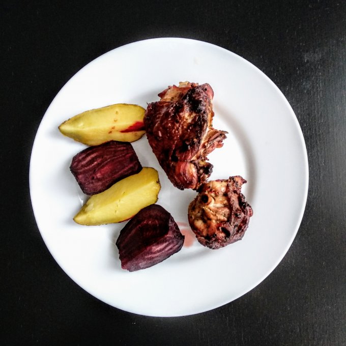 Куриный шашлык на гриле (в духовке) и запечённые картошка и свекла "в мундирах". КБЖУ во второй фотке.