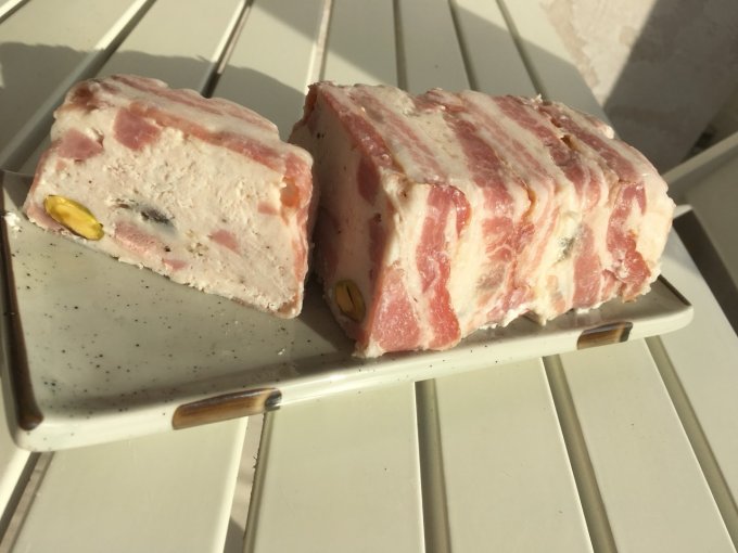Металлическую или стеклянную форму смазать оставшимся маслом, выложить полосками бекона так, чтобы края свешивались из формы, выложить фарш, сверху завернуть бекон, накрыть фольгой, сделать в ней дырочки и выпекать 40 минут при 180 градусах.