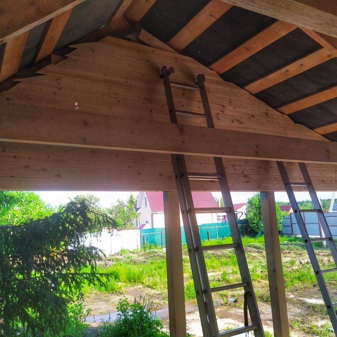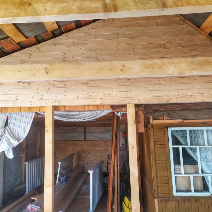 Зашивал 2 фронт она сегодня. Завтра буду врезать перила, и если успею, начну немного потолок. Забор и крыша приедут только в субботу. А в воскресенье мне уже ехать домой..