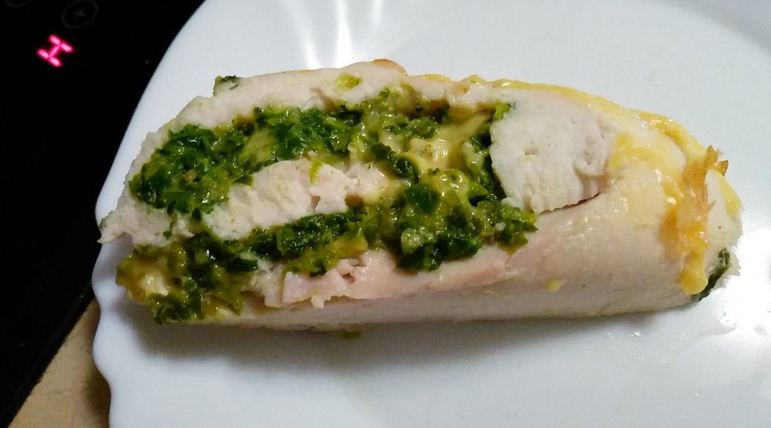 Разрезать куриное филе и развернуть книжкой, отбить, посолить, поперчить. Отдельно смешать в миске размороженный резаный шпинат и сыр, тоже немножко посолить. Выложить массу на филе, скрутить рулетом и положить в форму. И в духовку на 180 градусов на 50-60 минут. Всё )