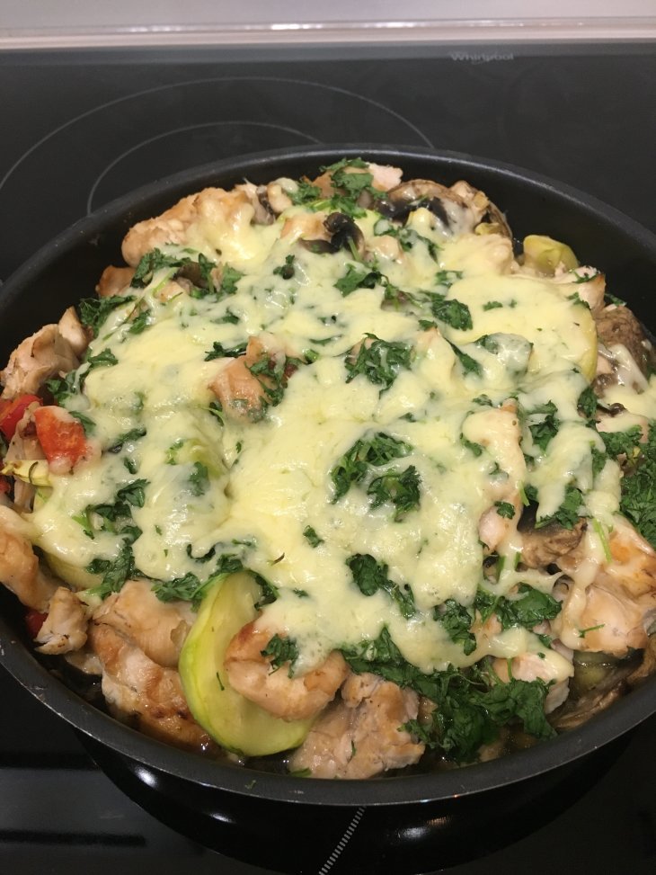 Поставила на 180 градусах на 45 минут. В процессе готовки, через 40 минут перемешала все и оставила доходить. Потом сверху натру сыр и кинзу и поставлю еще на 5 минут.