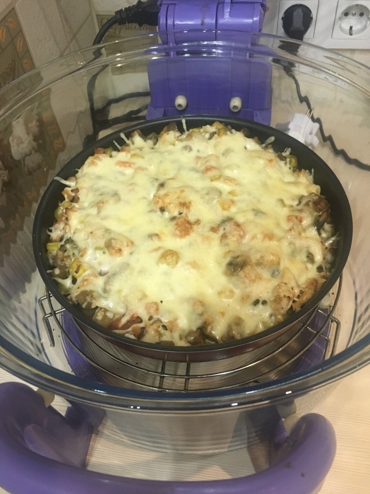 Вылить в форму для запекания, немного смазанную оливковым маслом, сверху посыпать нарезанными кружочками шампиньонами и запекать в аэрогриле на средней решетке, 205 градусах 20 минут. Очень вкусно, сытно и диетически.