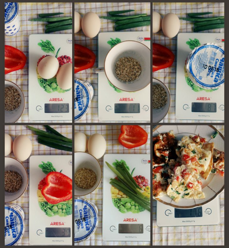 Все очень просто. Взбиваем вилкой 2 яйца, добавляем столовую ложку сметаны, 10 гр овсяных хлопьев, четвертинку болгарского перца и зеленый лучок. Выливаем на разогретую сковороду и жарим с двух сторон, а потом с удовольствием едим.)))