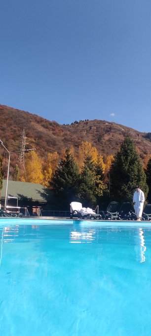 огромном бассейне под открытым небом, в окружении гор и звезд. Вот