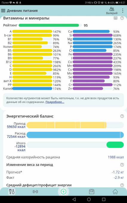 Хотел обменяться мнениями о результатах ведения ЗОЖ за ноябрь. Изменилась ли динамика по сравнению с октябрём? Все ли проводят анализ и делают выводы? В моем случае, для меня важен, на данный момент, результат снижения веса и рейтинг микронутриентов, кои и прилагаю. Просела группа витаминов В и рейтинг снизился на единичку. При этом ассортимент продуктов был обычным для меня по сезону, старался немного ограничивать себя только по калорийности.