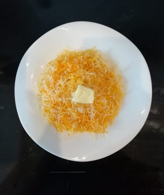 Натираем 1-2 репы, как морковь по корейски. Готовим в пароварке 20 мин. Добавляем натёртый сыр, масло и соль с сахаром по вкусу. При подаче на стол посыпаем кукурмой