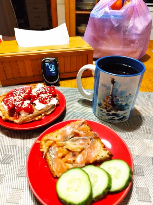 Завтрак сегодня быстрый, проспала, бежала на собрание. В 9:40 натощак 6,4 Через два часа после завтрака сахар 9,5 обхожусь без перекуса. В обеденное время сахар 6,6 сделала перекус с творожными вафлями, греческим йогуртом и гранатом. Как-то неправильно ем сегодня. Пошла шевелиться в уборке Выходной ...