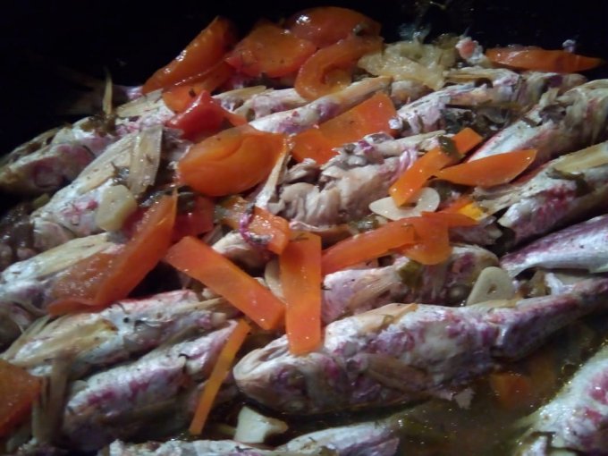 Рыбка вареная в небольшом количестве воды с чесноком, морковью, помидорами и зеленью