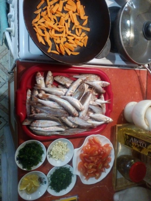 Посолить рыбу, аккуратно перемешать все ингредиенты, уложить слой рыбки брюшками вверх,и добавляя на дно и сверху все остальные ингредиенты. залить водой , присолить воду и отправить все в духовку. Как только закипит, шкара готова! Приятного аппетита!