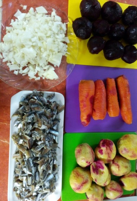 Сварить овощи, почистить, охладить, почистить соленую хамсу( или селедку )от голов, внутренностей и костей, порезать лук