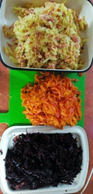 Натереть охлаждённые овощи на тёрке, уложить слоями: картофель, майонез, рыбка, лук, майонез, морковь, майонез, свекла, майонез.