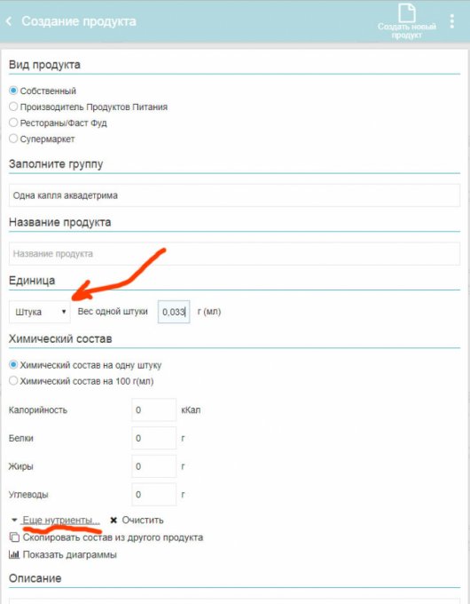 окне создания нового продукта кнопка "Еще нутриенты" и там в поле