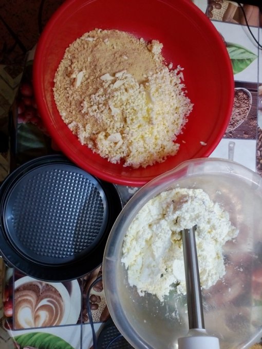 Печенье превратить в крошку. Я взяла "Мария", добавить размягченное масло, смешать, выложить в форму. У меня разъемная оказалась маленькой,поэтому пекла в сковороде. Диаметр должен быть не менее 24 см. Печенье с маслом в форме утрамбовать и поставить в разогретую духовку до 180 градусов, минут на 5