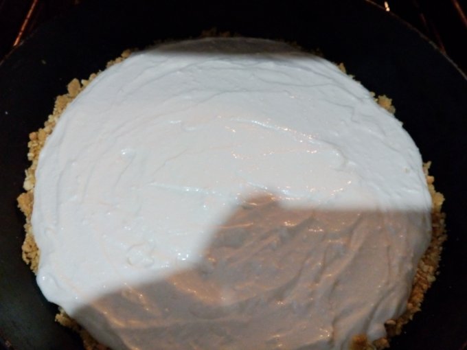 Выложить массу на печенье и отправить в духовку на 30-40 минут. По краям оно должно загустеть, но средина будет жидковатой, это нормально, загустеет при остывании.