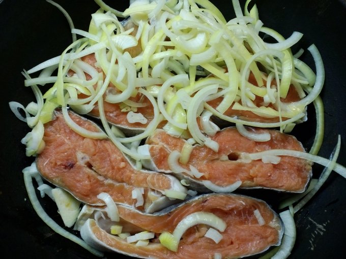Присолить с двух сторон, уложить в форму для запекания. Порезать и замариновать лук, для маринада смешать уксус, воду и 1 ч.л сахара. Оставить в маринаде на 15-20 минут, затем откинуть на дуршлаг и и уложить на рыбку
