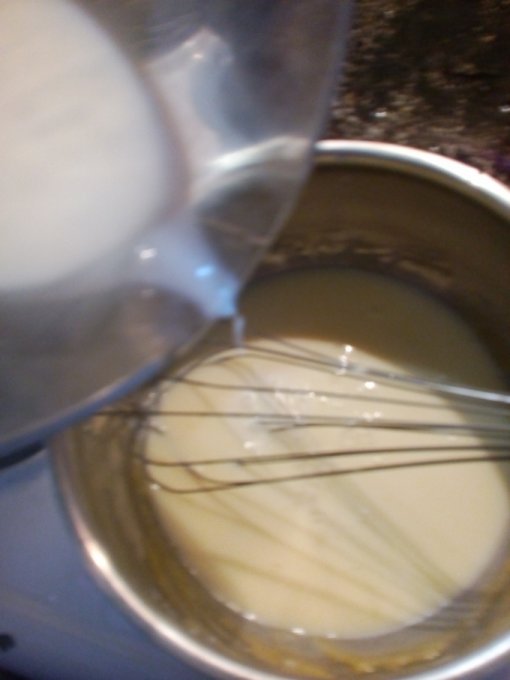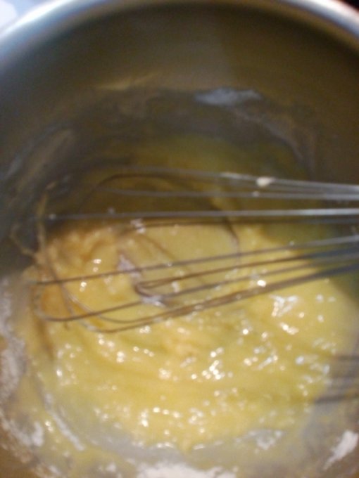 Пока маринуется лук, готовим соус бешамель: растопить масло, добавить в кастрюлю муку и хорошо перемешать венчиком.