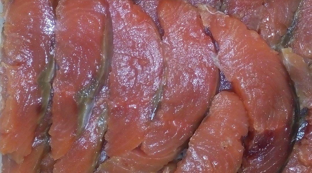 Кету, почистить, вымыть, промокнуть бумажным полотенцем, отрезать