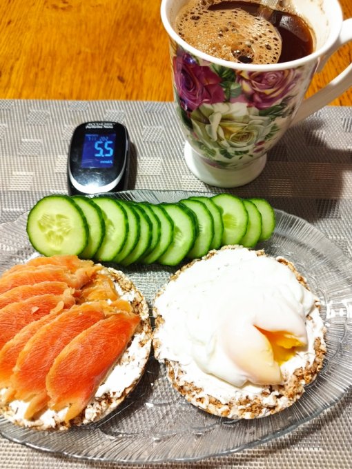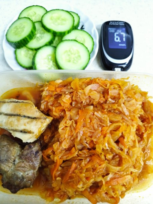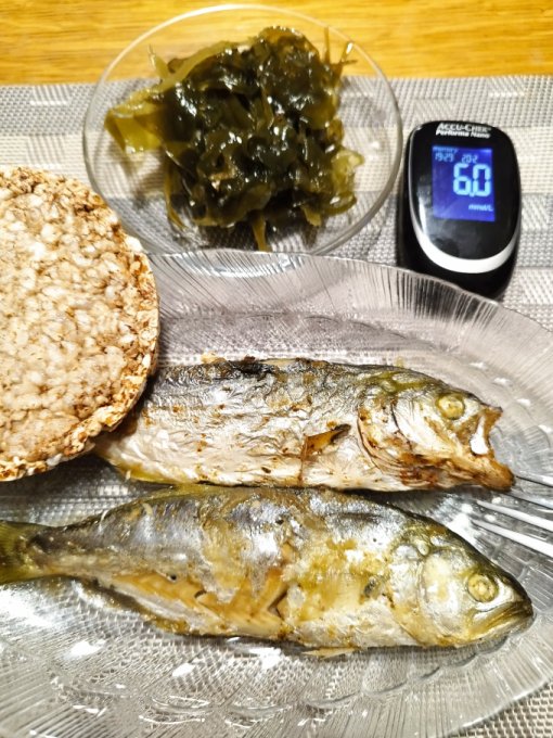 После обеда случился блин ... Масленица же. Как отказать угощающей женщине? Блин испортил показатель сахара в перекус. К ужину уже всё более менее наладилось. Пожарила печень, посчитала её калорийность, съела после рыбы такой бутер на хлебце и попробовала овощи, которые запекла. Таким образом получился перебор кбж. Завтра с этой печенью будут блины и с творогом.