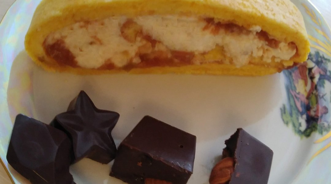 Рулет бисквитный со сметанным кремом. Бисквит с уменьшенным количеством сахара, облегчен тертой морковью. Крем можно готовить заранее, так как сметанному крему нужно дать немного застыть - приобрести густую консистенцию.