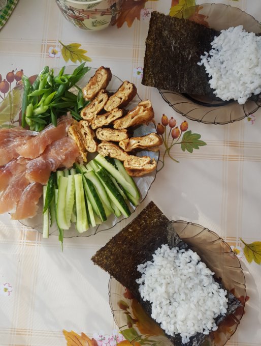 Ленивые роллы были вообще настоящим открытием! Засолила форель, сделала омлет (не очень вышел, торопилась), рис как для обычных роллов, только нори разрезали и каждый сам себе накладывал начинку и сворачивал роллы. Вышло быстро, без лишней возни с циновкой, и очень вкусно.