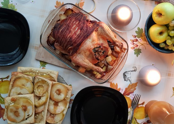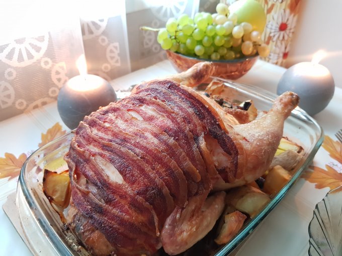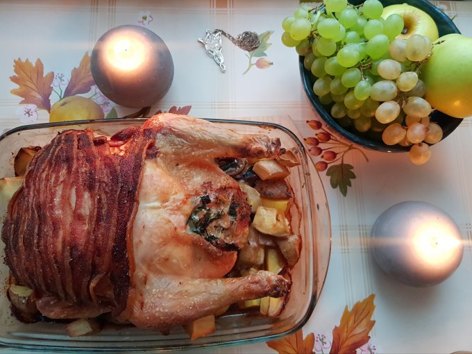 Оба рецепта подсмотрела в блоге "Из Одессы с морковью". Первый - курица с беконом, а еще с хлебом, луком, беконом и яйцом внутри, впервые фаршировала курицу. В целом просто, но требует некоторых телодвижений в плане начинки. На гарнир грибы и картофель, бонусом вкусная подливка. Цена блюда вышла в пределах 350 р., обычно мы вдвоем такое едим 2-3 дня (1 раз в день).