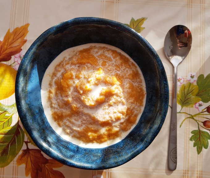 Для конкурса я выбрала традиционное осенне-зимнее блюдо, очень простое и не самое популярное среди иностранцев - кашу из сладкой тыквы. Есть знаменитый корейский шеф-повар Пэк Чонвон, он ратует за простоту приготовления блюд и я взяла за основу его рецепт. На кг очищенной тыквы 50 г риса, 300 мл молока, 1 ч.л. меда, 1/2 ч.л. корицы, мускатного ореха и имбиря, соль. Мед можно убрать, если тыква сладкая. Опять же, блюдо очень простое, потому что накануне операции я готовила из того, что было под рукой. В оригинальном рецепте тыква варится и пюрируется, рис варится в воде и тоже разбивается блендером, все смешивается, в итоге тыква мягкая, рис половинками крупинок. Я добавила специи для ароматики, рис варила на молоке, чтобы пряность уравновешивалась сливочностью. При подаче можно полить сливками.)