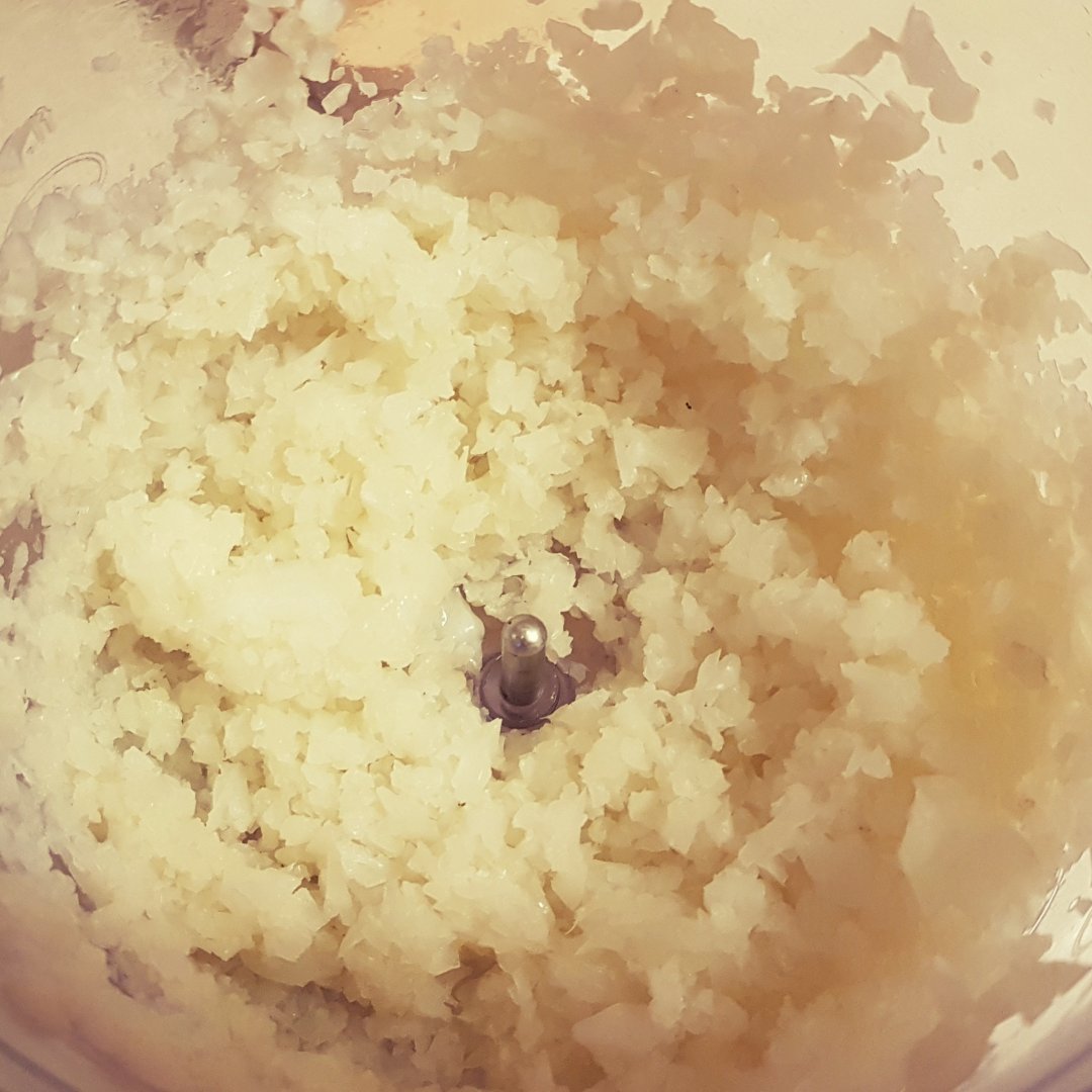 Соцветия нарезать на кусочки и сложить в чашу миксера. Туда же положить нарезанный лук. Перебить в однородную массу.