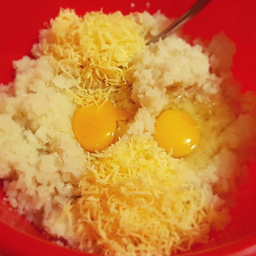 Полученную массу выложить в глубокую миску. Добавить яйца, половину сыра и хорошо вымешать.
