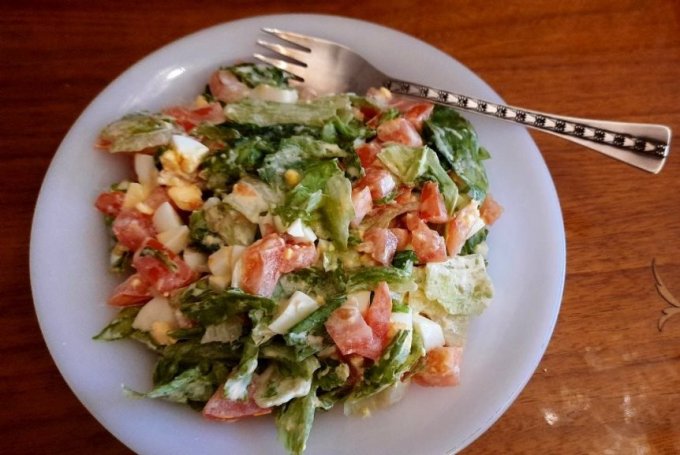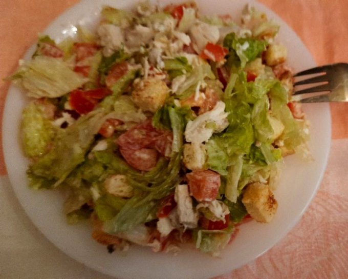 На обед был салат: варёная курица, кусочки хлеба, слегка обжаренные без масла, помидор и много латука. Взвесила на бумажке и майонез, чтобы точно знать. :crazy: