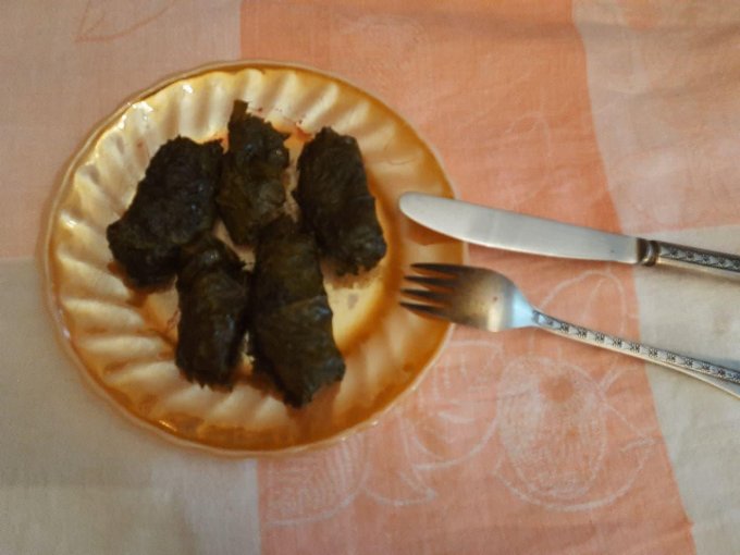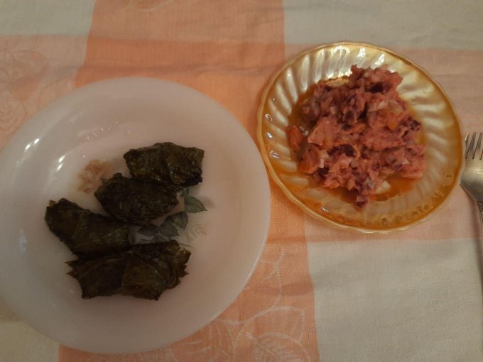 Вчера пива не пила и сразу прогресс: небольшой отвес впервые за долгое время. Это не может не радовать. Доела салат с селёдкой, а на ужин приготовила долму в листьях...Калорийность указала примерную, не высчитывала. Удалось взять фарш из говядины с бараниной, это более редко и питательно, думаю.