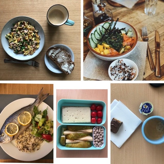 Вчера у кого-то в комментариях прозвучала идея, чтобы было бы интересно посмотреть на фотографии блюд. Меня это вдохновило на то, чтобы сделать фото всего, что я ела) Я когда-то так делала в течение месяца или около того. Помню, интересно было видеть свой рацион на одной картинке! Правда фото обеда пришлось взять из Интернета, потому что я заболталась с коллегой и совершенно забыла сфотографировать свою тарелку. Также в кадр не попали еще одна чашка кофе на работе и две оливки, которые я сточила, пока готовился ужин.