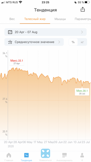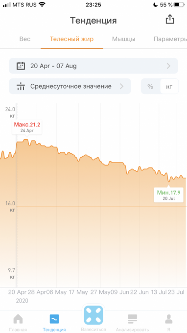С точки зрения здоровья, в моем возрасте норма - до 35%. Но это уже верхняя граница! Я хочу 25%. Это будет оптимально с точки зрения здоровья и, думаю, красиво!