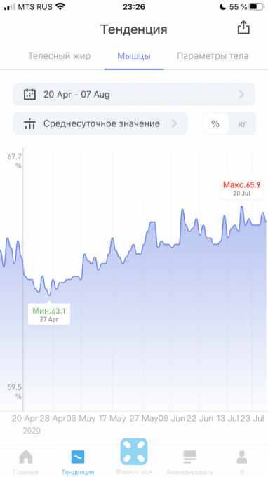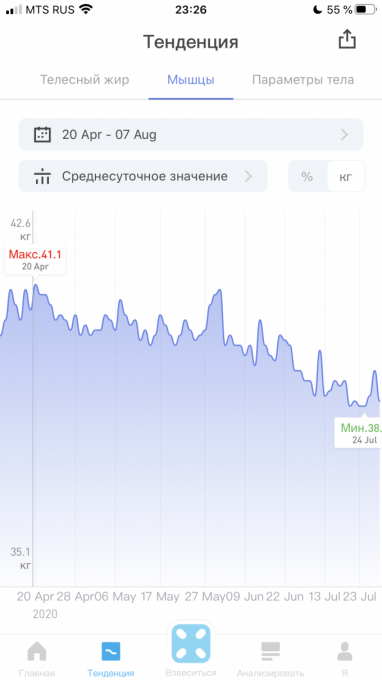 Реальность такова, что сейчас процент жира у меня 30%. 3 месяца назад был 33%. Процент мышечной массы за тот же период вырос, хотя объем сократился. Другими словами, худея, мы я потеряла не только жир, но и мышцы.
