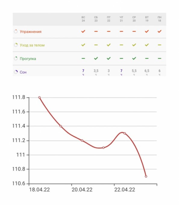 Что имею сейчас. Двое детей: 3г и 7 месяцев. Старшая с некоторыми особенностями развития (АЧ, СДВГ, ЗПРР и пр.). Моему ментальному здоровью (и, как следствие, самоконтролю) это, конечно, тоже не способствует. А младшая просто маленькая, ещё будит по ночам и тд. Во всей этой кутерьме и потере себя как личности, никак не удаётся найти ресурс на себя. Не то что похудеть и заняться спортом. Я тупо даже витамины забываю пить. А надо, как минимум анемию вылечить. Наверняка и другие дефициты есть. Да и хоть что-то иногда делать для себя. Отчасти и для этого решила завести дневник. Помимо калорий, чтобы отслеживать сон, настроение, прогулки, искать простые радости и не забывать их себе устраивать. Тем более внешних ресурсов у меня достаточно (вот только внутренних маловато). С младшей помогает бабушка (когда я на занятия езжу со старшей, а они почти каждый день). Две недели назад я вот наконец нашла частный садик на неполный день для старшей, куда согласились нас принять и пока вроде, тьфу-тьфу, всё нормально.