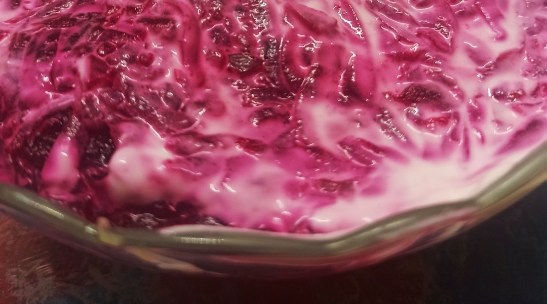Далее выкладываем свеклу, смазываем сметаной. Свеклу сметаной можно не смазывать, или можно после завершающего слоя сметаны сверху посыпать тертым яйцом или сыром.