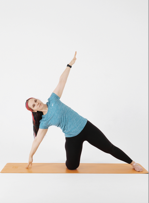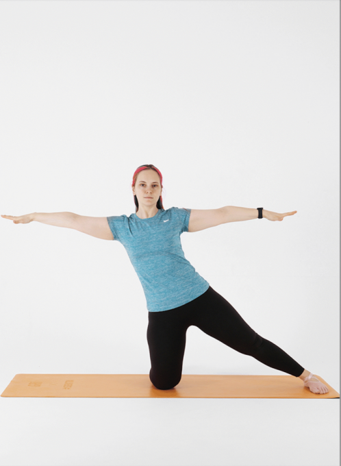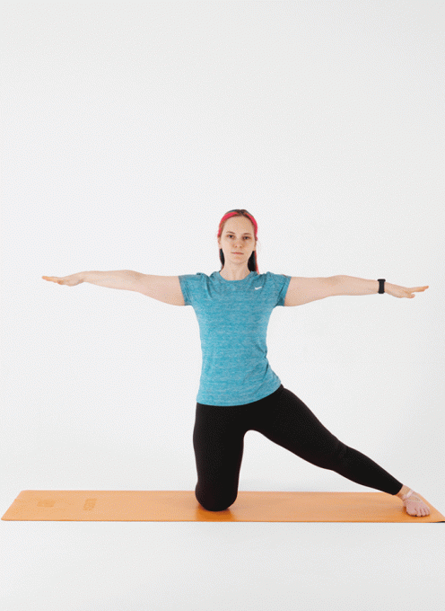 Это как обычный жим на плечи, но из положения стоя на одном колене. Чтобы мышцы кора еще дополнительно проработать и стабильность плеча. Прикрепила картинки, представим, что в левой руке у девушки вес и она его выжимает вверх, а потом наклоняется вправо и за счет пресса поднимает себя в исходное положение.