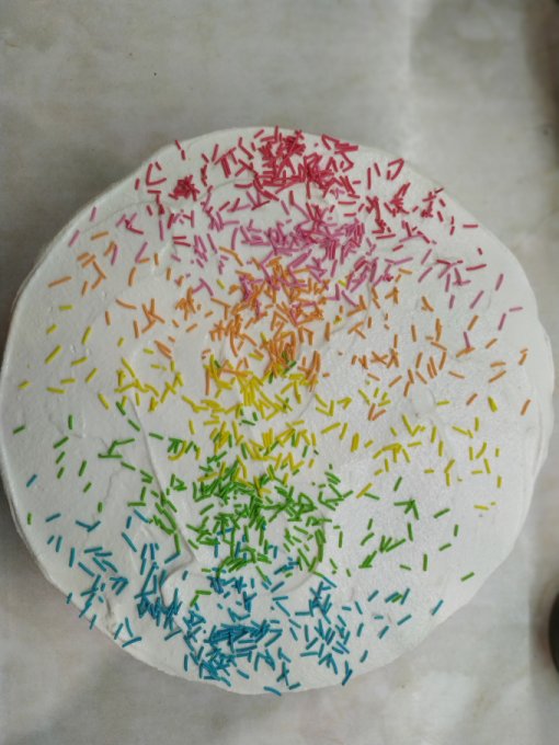 Хотела просто белым оставить, но на беду вспомнила, что у меня посыпка разноцветная есть. Нормальный человек простопосыпал бы, но я же ж с шилом в одном месте. Час с пинцетом сортировала по цветам, муж хихикал))