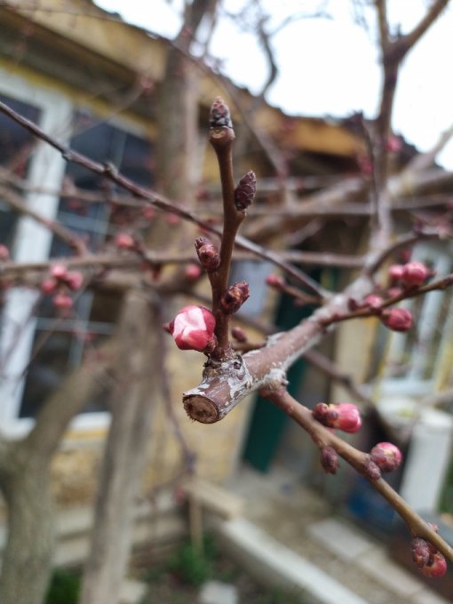 Абрикос зацветает, но плодов, наверное, не будет. Холодина, ни одной пчелы. Давно такого холодного марта не было. Куда-то дела макро линзу, так что фото как получилось