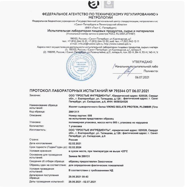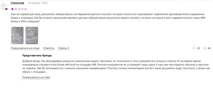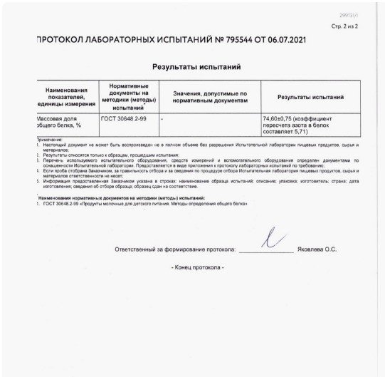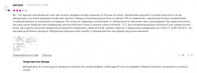 Лабораторный анализ, результаты которого были приведены на сайте Отзовик, был проведён некорректно. Сначала лаборатория применила коэффициент расчёта для растительного белка и потому получился результат в сорок с небольшим процентов. После расчёта применительно к молочному белку результаты были совсем иные.