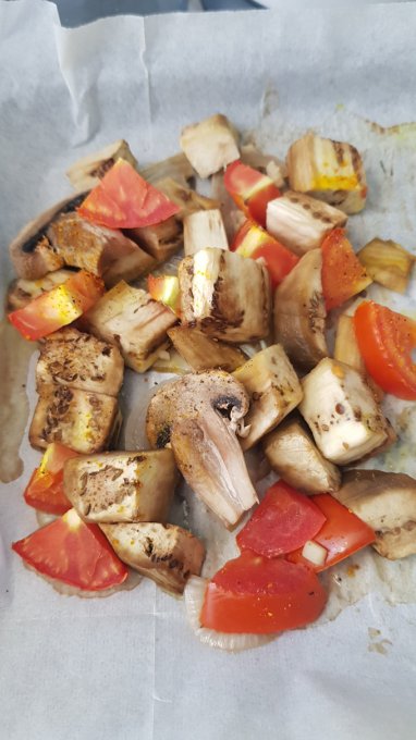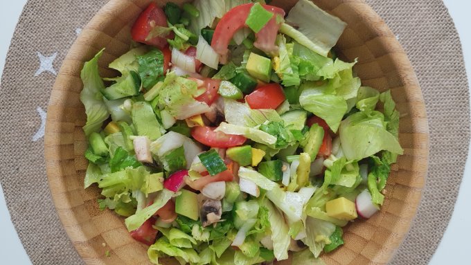 Салат, запеченые овощи и кускус на обед. С лимонным соком в салате немного "переборщила", но в сочетании с кускусом получается нормально.
