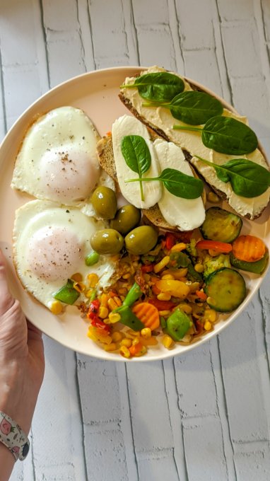 Завтрак. Яичница, тосты с сыром и хумусом, оливки, овощная смесь. На десерт была клубника 🍓.