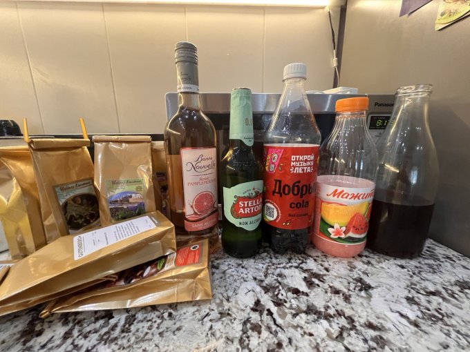 На фото топчик алкозаменителей на внезапных мероприятиях (+фреши и кофе с молоком. молоко не хочу убирать, мне вкусно.). Мажитель для меня сладковат, я его развожу с водой 50/50. Было еще красное Ламбруско 1:3 с газ.аква минерале. Прекрасный морсик получился.