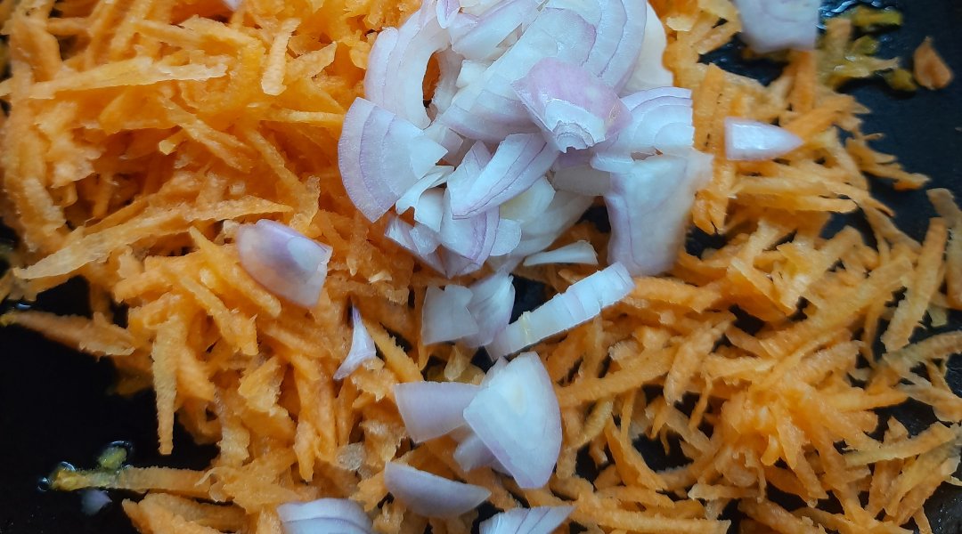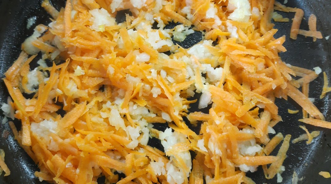 Чистим лук и морковь, измельчаем. В сковороду наливаем масло и тушим овощи до готовности