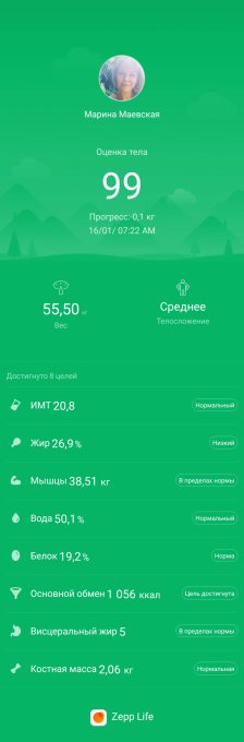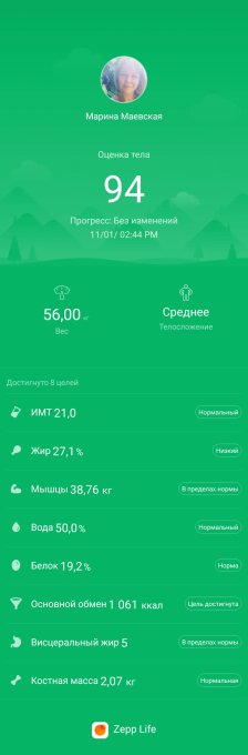 У меня сегодня недобор. Ездила сдавать экзамен по охране труда, всё там подзатянулось. Потом очередь за посылкой на почте. Мужу пришли нитки для вязания "мушек", счастлив как ребёнок 🤭 В итоге обед был поздний, перекус пришлось удалить (хоть и планировала овощной салатик), ужин по расписанию . Зато порадовали замеры🥰 Хоть объемы и не меняются, зато меняется рейтинг тела. Как я хотела увидеть эту цифру 🙏 Жировая пошла в минус, а мышцы в плюс.