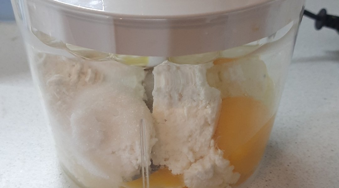 Творог, яйца, муку, соль, сахар, соду сложить в чашу блендера