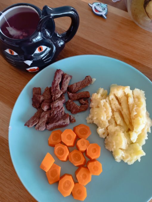Обед: сместить время на более раннее. Здесь вареный картофель с добавлением масла, говядина тушёная на сковороде и морковь, приготовленная на пару